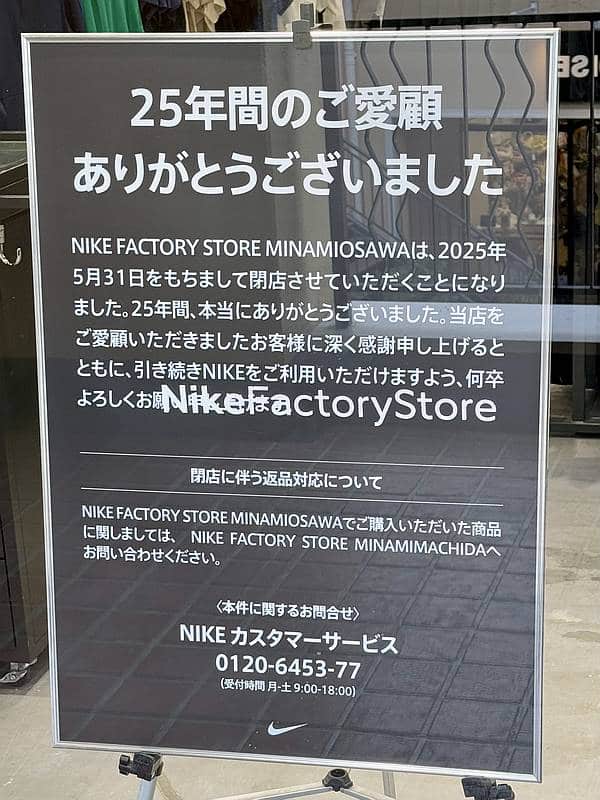 ナイキファクトリーストア南大沢店の店頭に2025年5月31日閉店のお知らせ看板には「25年間のご愛顧ありがとうございました」とのメッセージ