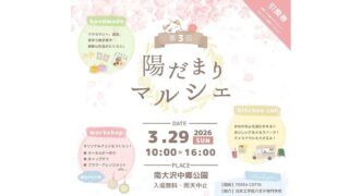 イベント情報 第3回陽だまりマルシェが3/29に南大沢中郷公園で開催!キッチンカーなど85店も出店 2026年3月29日(日)に南大沢駅前の南大沢中郷公園にて「第3回陽だまりマルシェ」が開催されます。 ハンドメイド作品の販売やワークショップ、キッチンカーなど、総勢85店舗が集結する大規模な地域イベントです。 入場無料で誰でも気軽に楽しむこ... 2026.03.05 イベント情報遊び